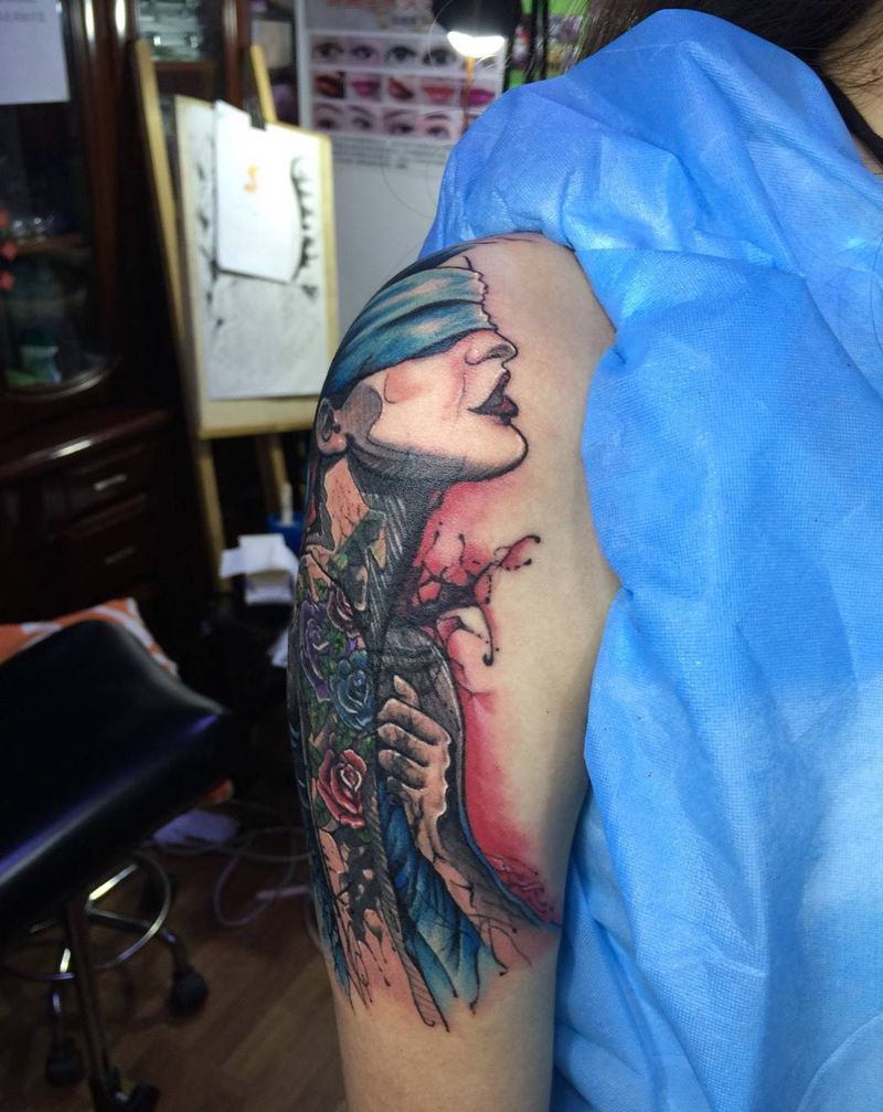 水墨美女 遮盖前后对比纹身图片_成品手臂国画人物原创纹身图案