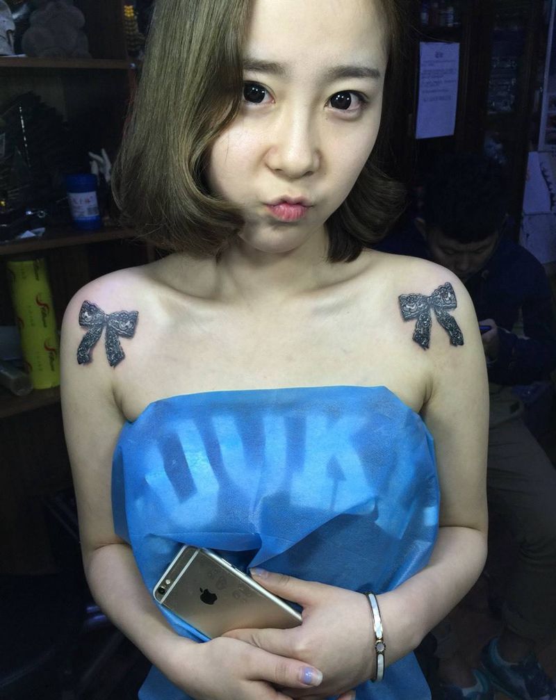 蕾丝蝴蝶结纹身图片_成品肩部清新纹身图案