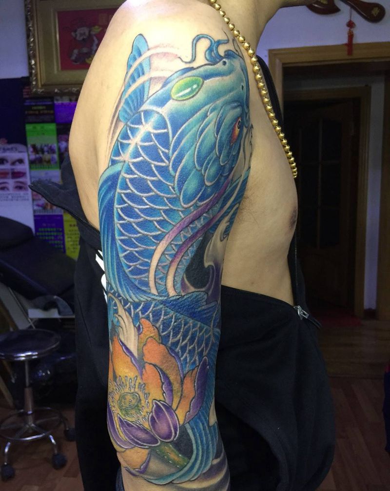 鲤鱼遮盖图腾 前后对比纹身图片_成品手臂传统动物纹身图案