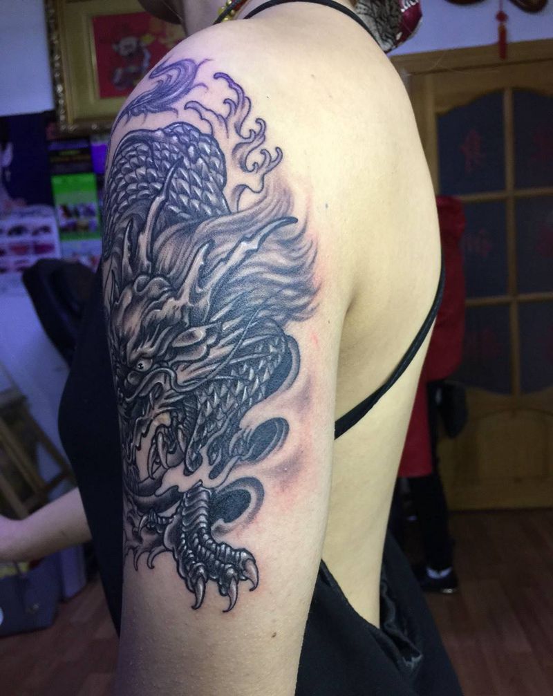 当前位置: 首页 >吉林省长春市纹身店-彫客堂刺青纹身图案>黑灰麒麟纹身图片_成品手臂传统动物纹身图案