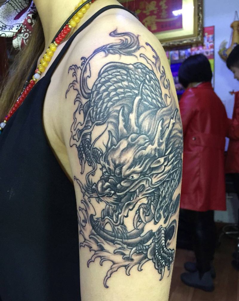 当前位置: 首页 >吉林省长春市纹身店-彫客堂刺青纹身图案>黑灰麒麟纹身图片_成品手臂传统动物纹身图案