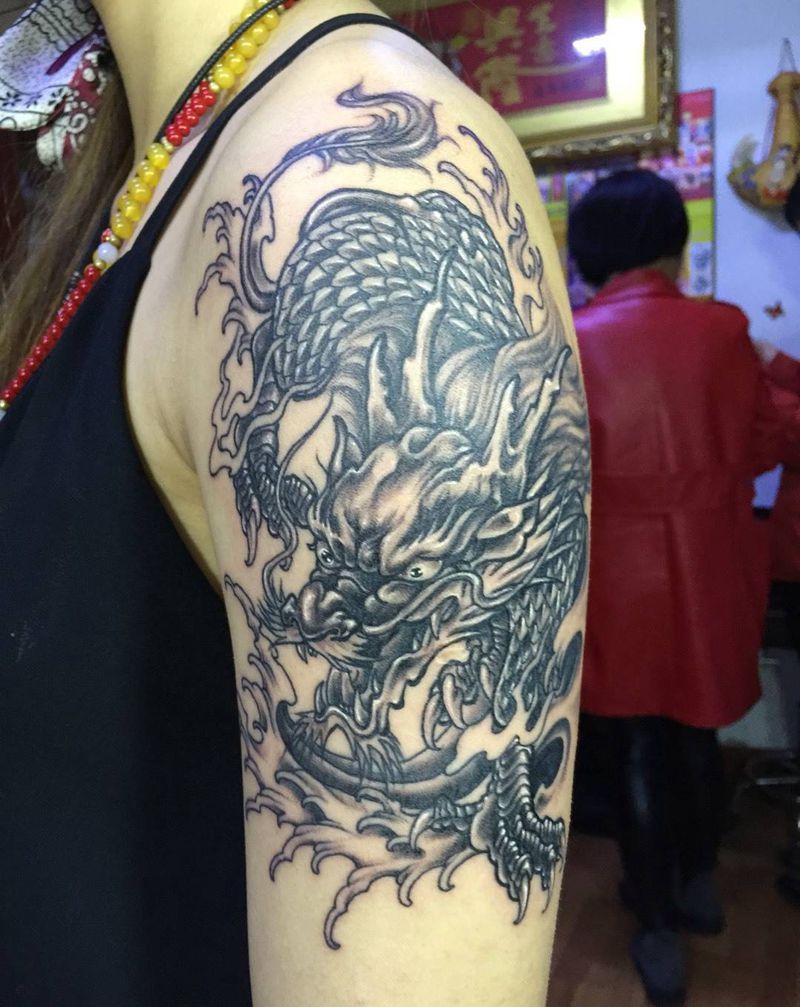 当前位置: 首页 >吉林省长春市纹身店-彫客堂刺青纹身图案>黑灰麒麟纹身图片_成品手臂传统动物纹身图案