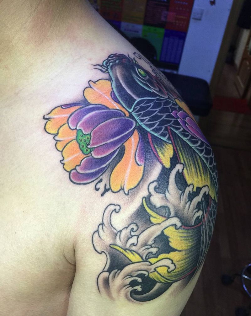 肩上鲤鱼纹身图片_成品肩部传统动物纹身图案