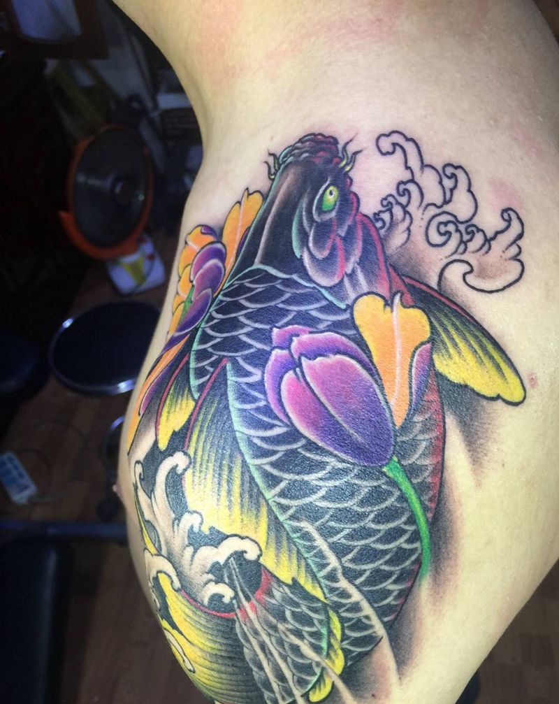 当前位置: 首页 >吉林省长春市纹身店-彫客堂刺青纹身图案>肩上鲤鱼纹身图片_成品肩部传统动物纹身图案