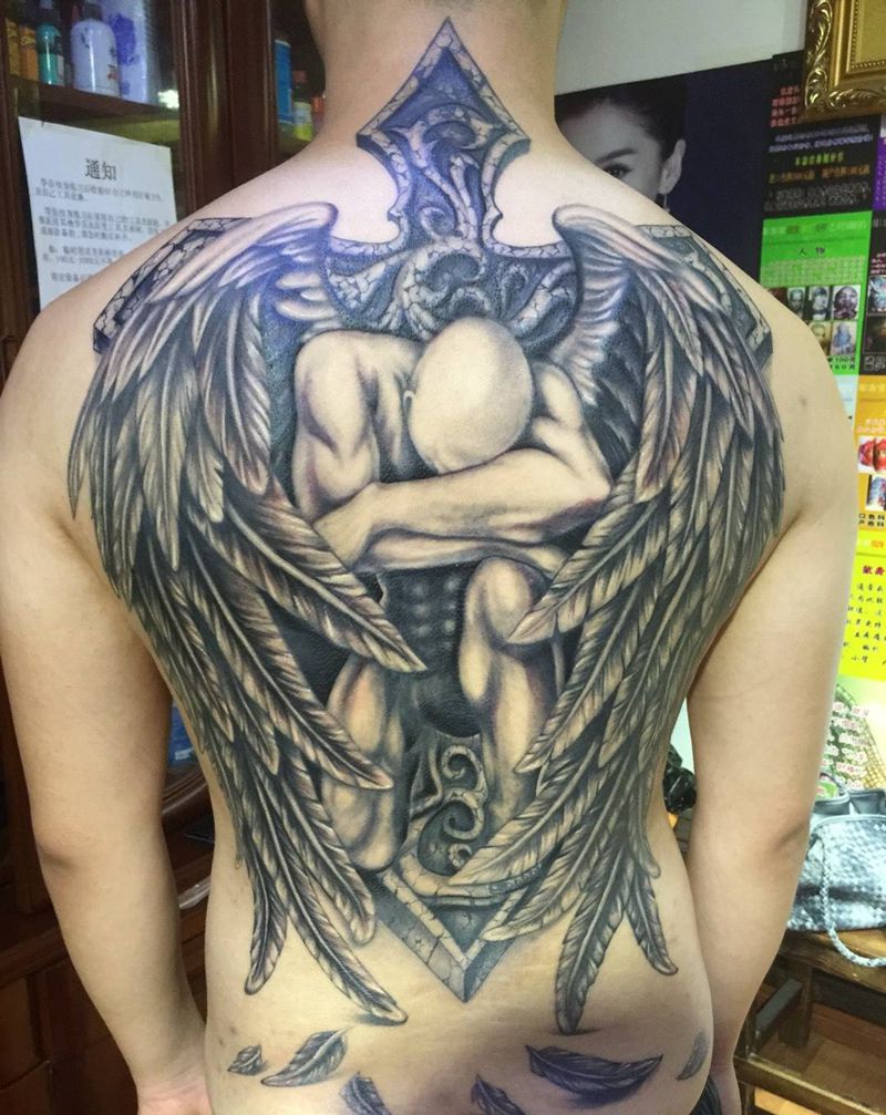 当前位置: 首页 >吉林省长春市纹身店-彫客堂刺青纹身图案>坠落天使纹身图片_成品背部传统人物纹身图案