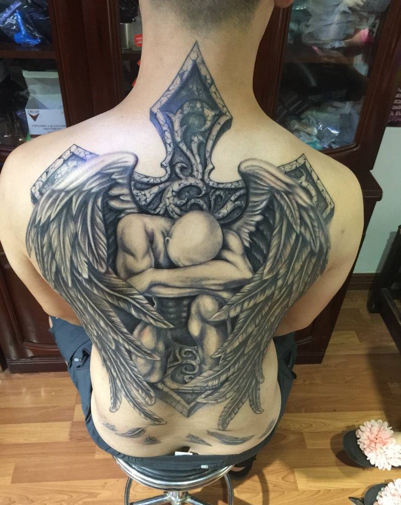 坠落天使纹身图片_成品背部传统人物纹身图案