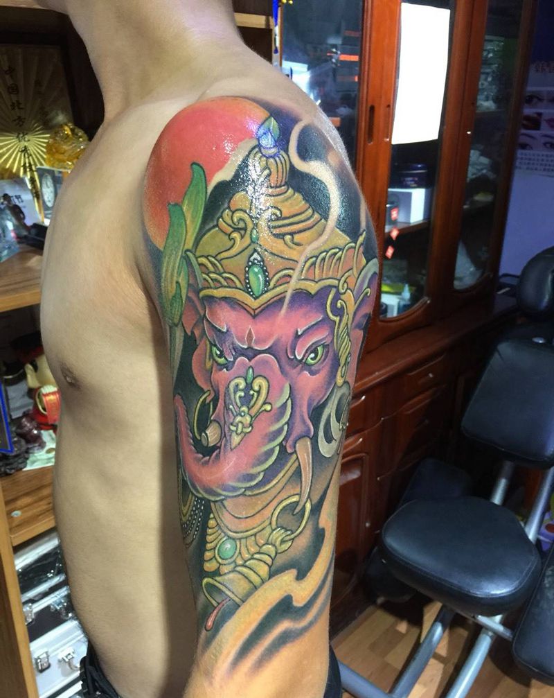 当前位置: 首页 >吉林省长春市纹身店-彫客堂刺青纹身图案>大臂象神 修改遮盖前后对比纹身图片_成品遮盖动物传统手臂纹身图案