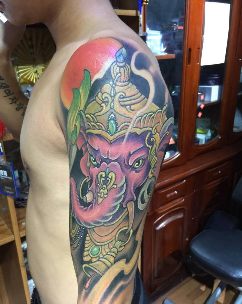 当前位置: 首页 >吉林省长春市纹身店-彫客堂刺青纹身图案>大臂象神 修改遮盖前后对比纹身图片_成品遮盖动物传统手臂纹身图案