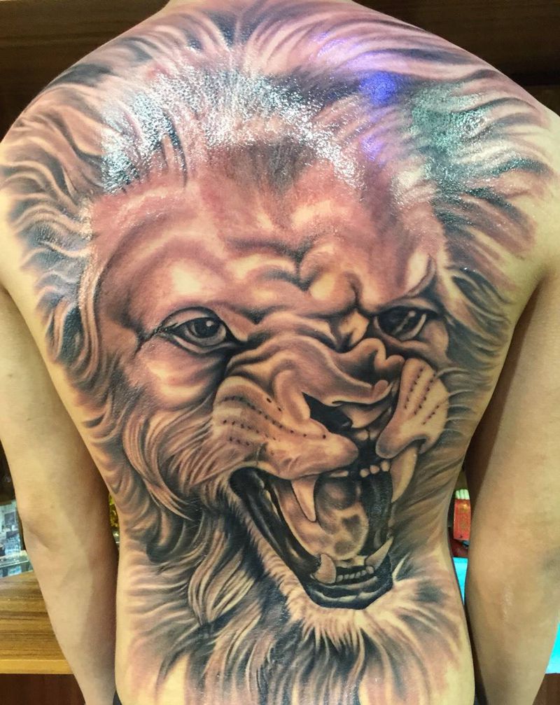 狮吼 未完成待续纹身图片_原创动物背部写实纹身图案