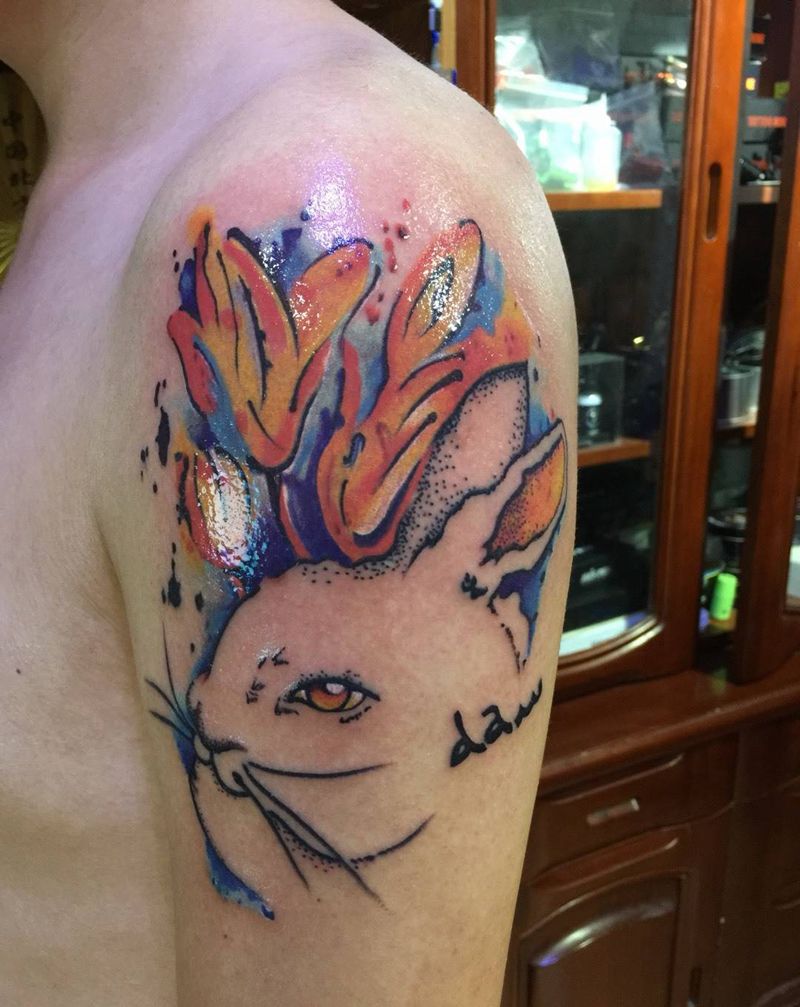 当前位置: 首页 >吉林省长春市纹身店-彫客堂刺青纹身图案>水彩小兔子纹身图片_成品手臂清新动物纹身图案