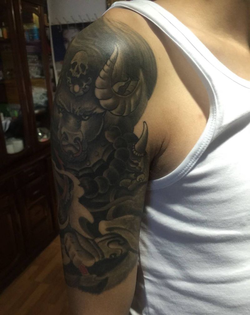 当前位置: 首页 >吉林省长春市纹身店-彫客堂刺青纹身图案>牛魔王修改前后对比纹身图片_遮盖成品手臂传统鬼神纹身图案