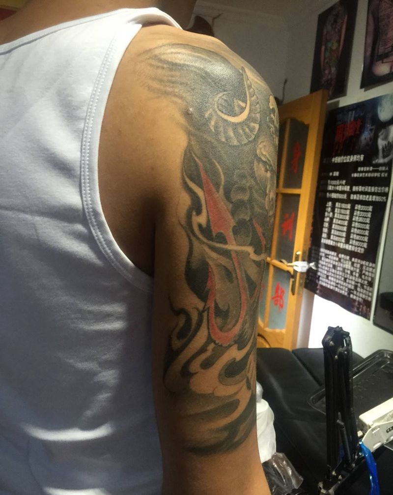 牛魔王修改前后对比纹身图片_遮盖成品手臂传统鬼神纹身图案
