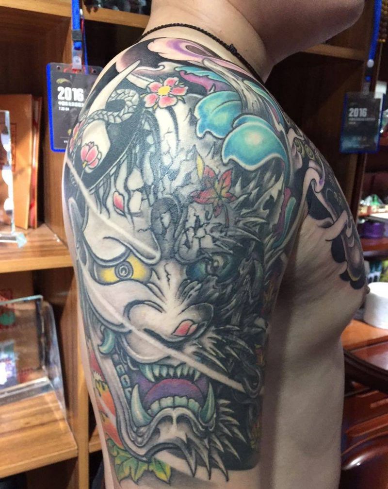 善恶一念间 遮盖作品纹身图片_遮盖成品手臂胸部传统鬼神纹身图案