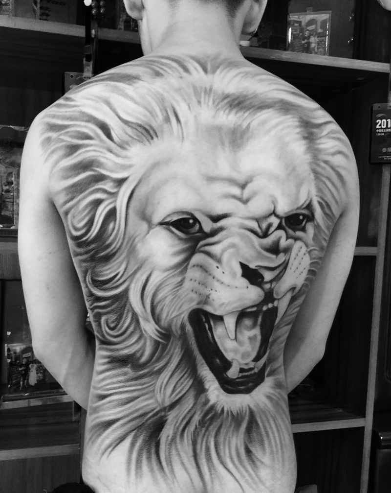 狮子 未完成待续纹身图片_背部动物原创写实纹身图案