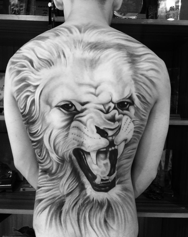 狮子 未完成待续纹身图片_背部动物原创写实纹身图案