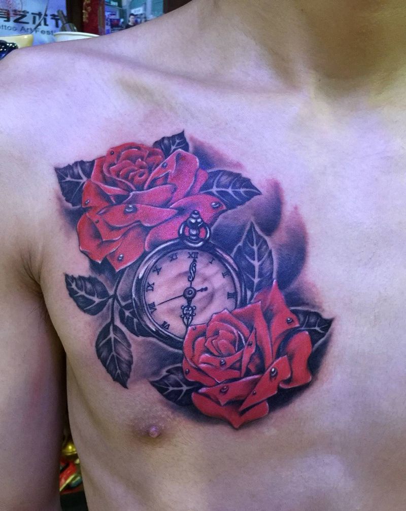 玫瑰怀表纹身图片_成品胸部欧美原创纹身图案