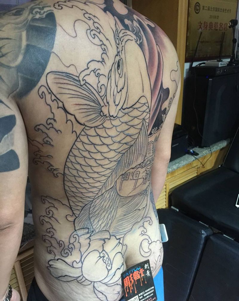 满背鲤鱼跃龙门 未完成纹身图片_背部传统原创纹身图案