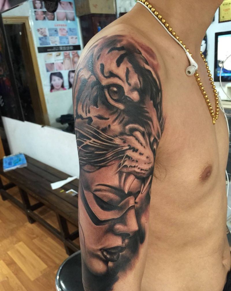 披着虎皮的女人 未完成待续纹身图片_手臂写实欧美人物纹身图案