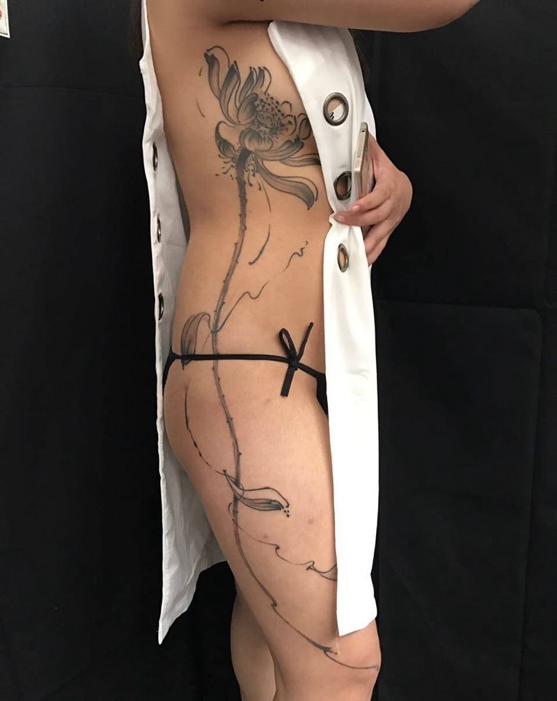 荷花纹身图片_成品腰部脚部胸部臀部传统国画清新植物原创纹身图案