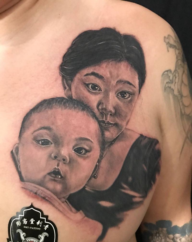 爱人孩子照片纹身图片_成品胸部肖像原创人物纹身图案