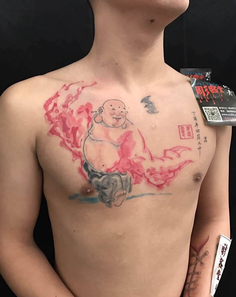 福在眼前纹身图片_成品原创国画胸部人物纹身图案