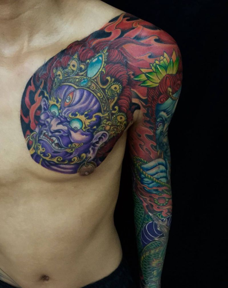 当前位置: 首页 >吉林省长春市纹身店-彫客堂刺青纹身图案>大黑天不动冥王花臂纹身图片_手臂胸部传统人物鬼神纹身图案