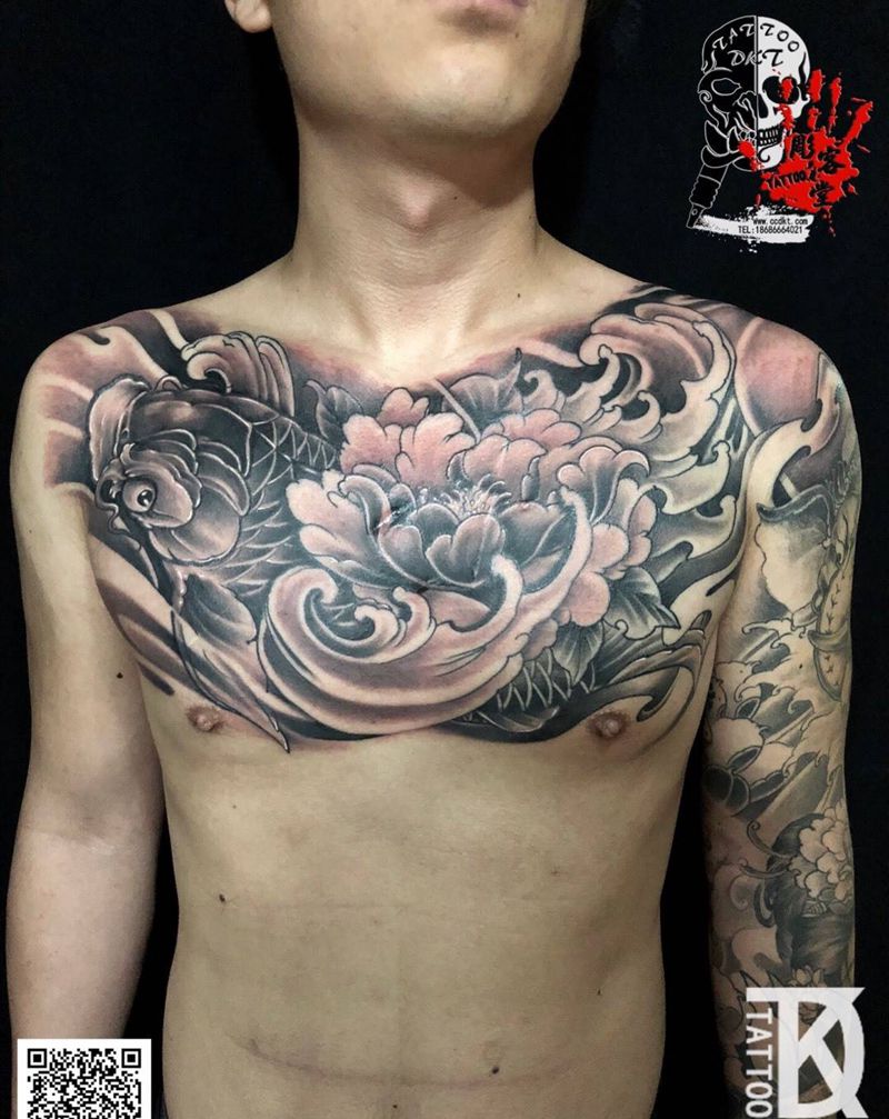 鲤鱼花胸纹身纹身图片_成品胸部传统动物纹身图案