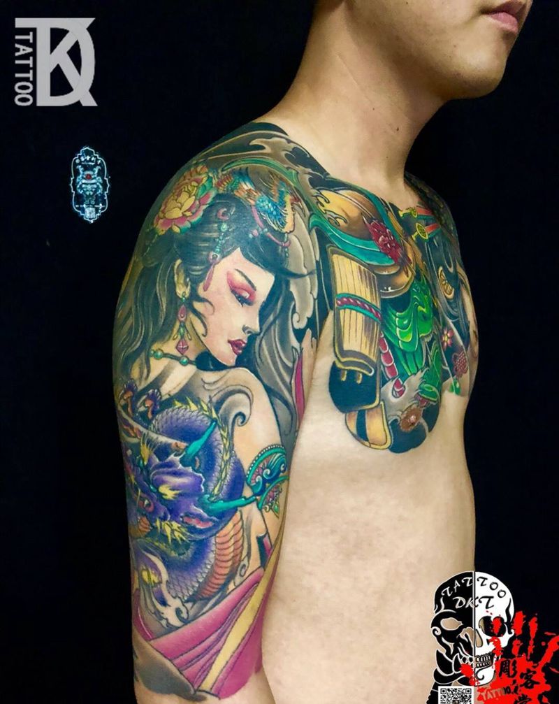 花胸加两个大臂纹身图片_胸部手臂新传统纹身图案