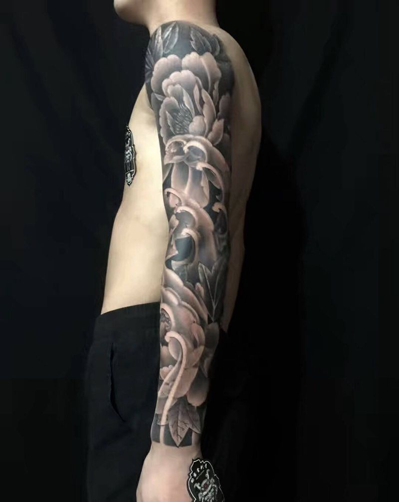 富贵牡丹单色花臂纹身图片_成品手臂传统国画植物原创纹身图案