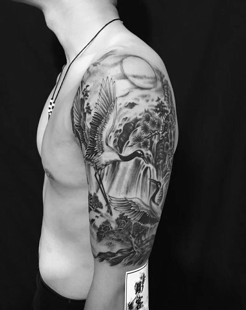 松鹤延年纹身图片_成品手臂传统国画原创动物纹身图案