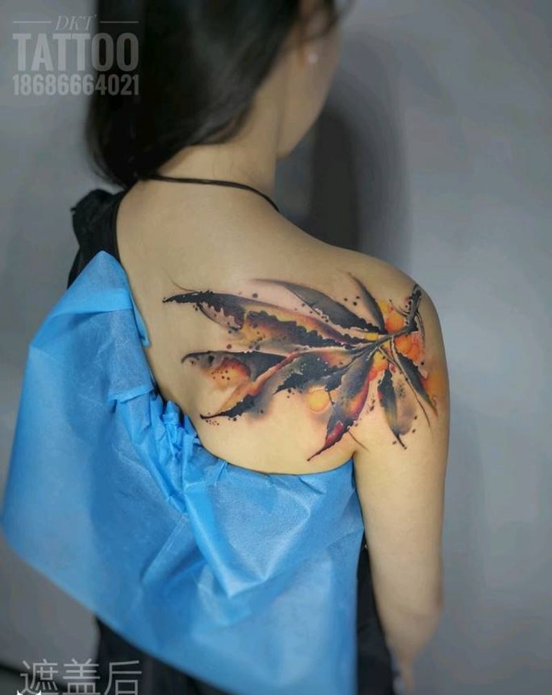 水墨叶 遮盖作品纹身图片_肩部背部水墨纹身图案