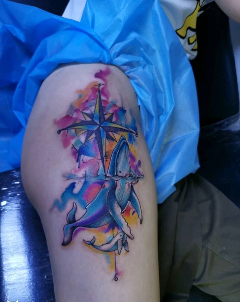 水彩蓝鲸指南针纹身纹身图片_腿部臀部水彩纹身图案