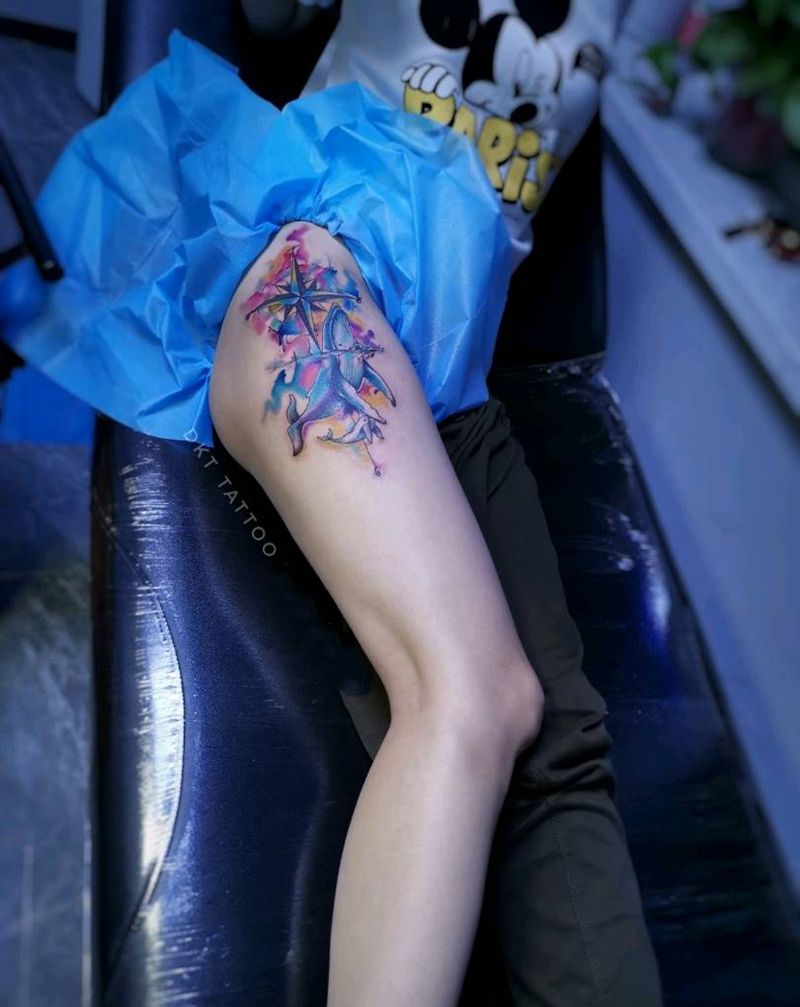 水彩蓝鲸指南针纹身纹身图片_腿部臀部水彩纹身图案