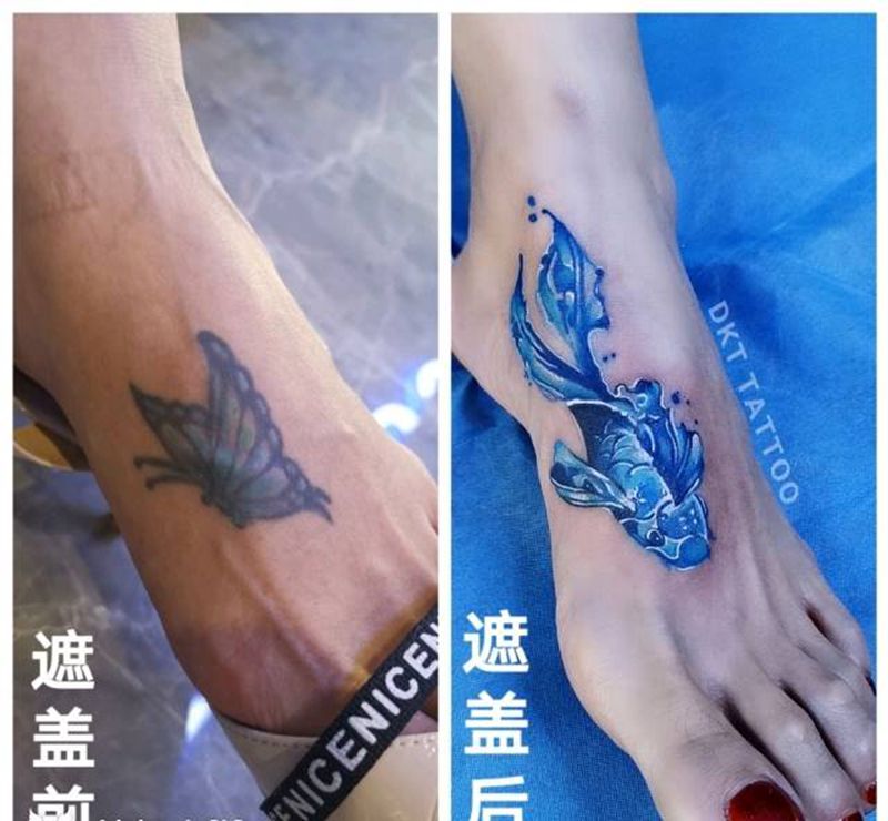 水彩金鱼纹身,遮盖旧图蝴蝶,纹身图片_脚部水彩遮盖作品金鱼纹身图案