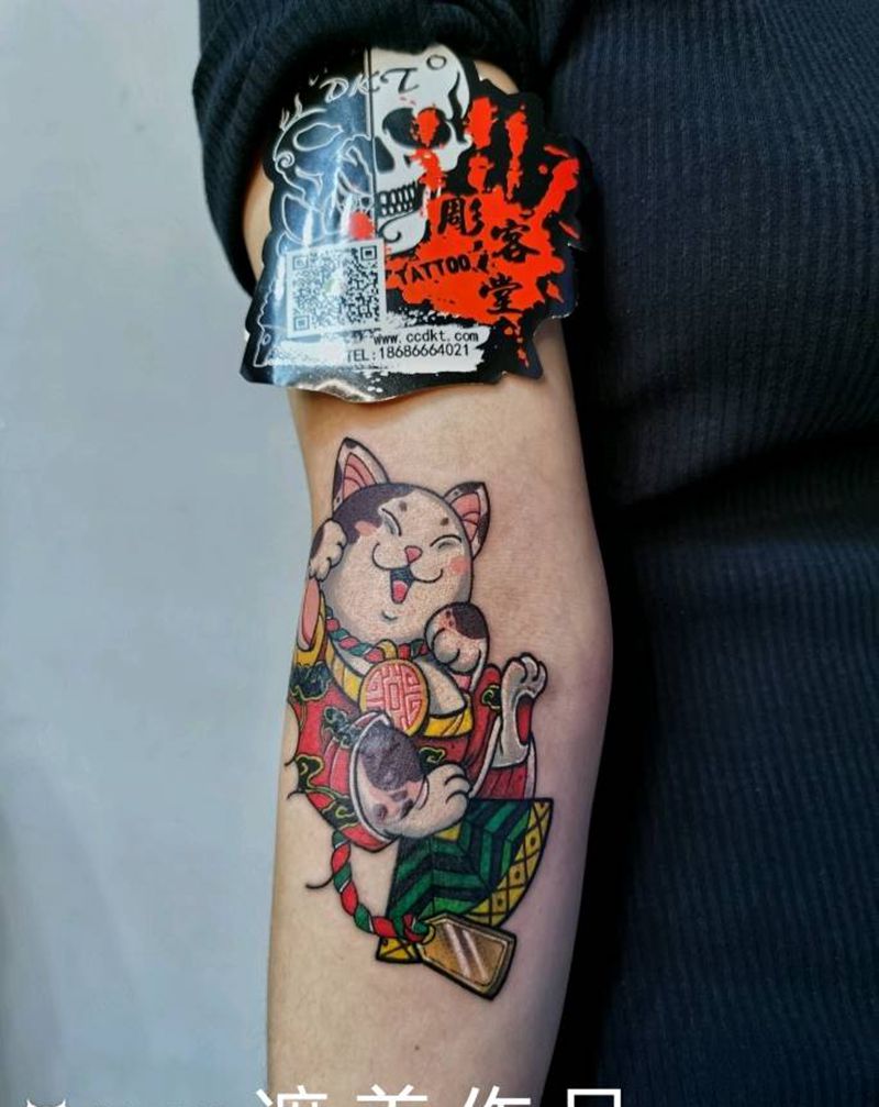 招财猫遮盖作品纹身图片_新传统遮盖纹身图案