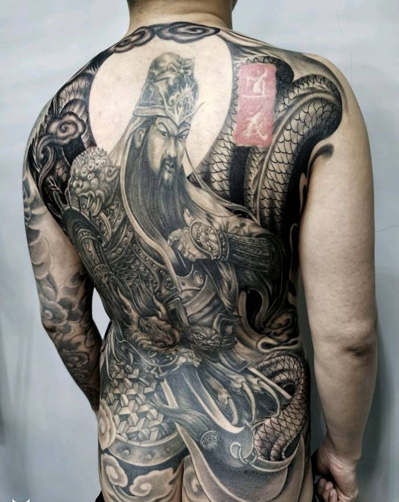 满背关羽纹身图片_背部新传统欧美写实纹身图案