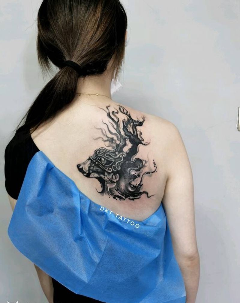 福鹿遮盖作品纹身图片_背部水墨遮盖纹身图案