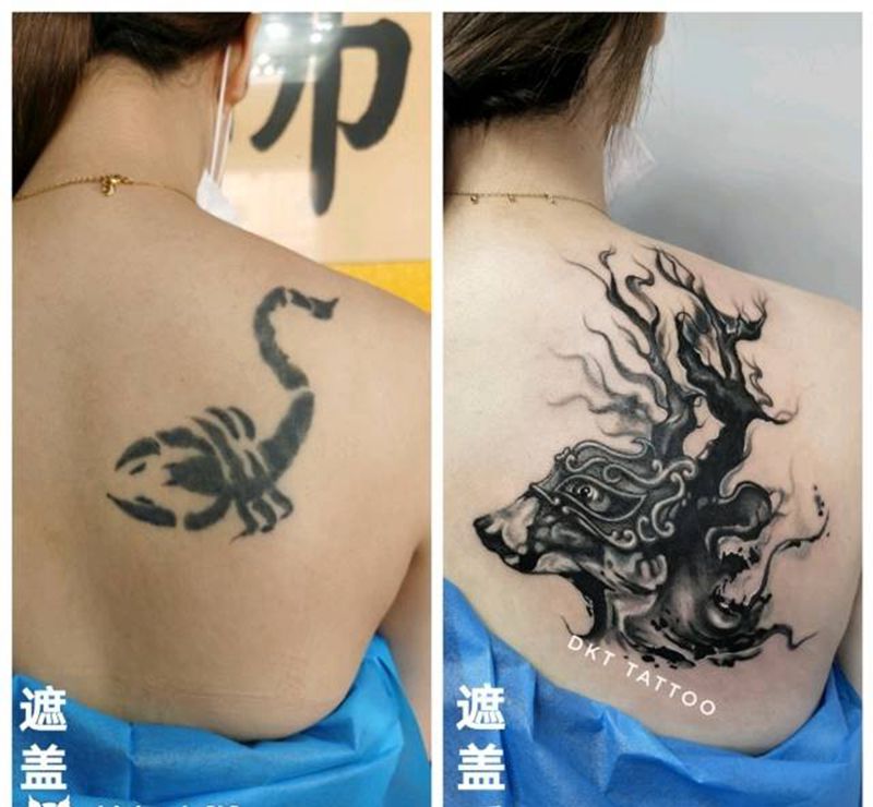 福鹿遮盖作品纹身图片_背部水墨遮盖纹身图案