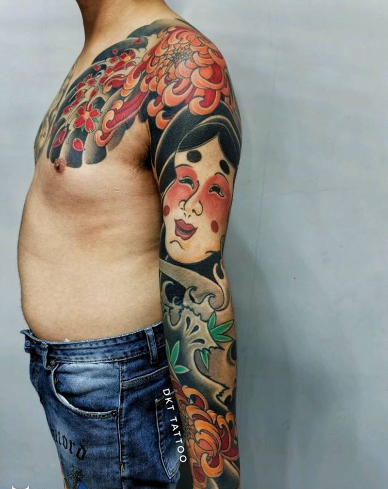 当前位置: 首页 >吉林省长春市纹身店-彫客堂刺青纹身图案>老传统花臂能面菊花纹身图片_手臂老传统纹身图案