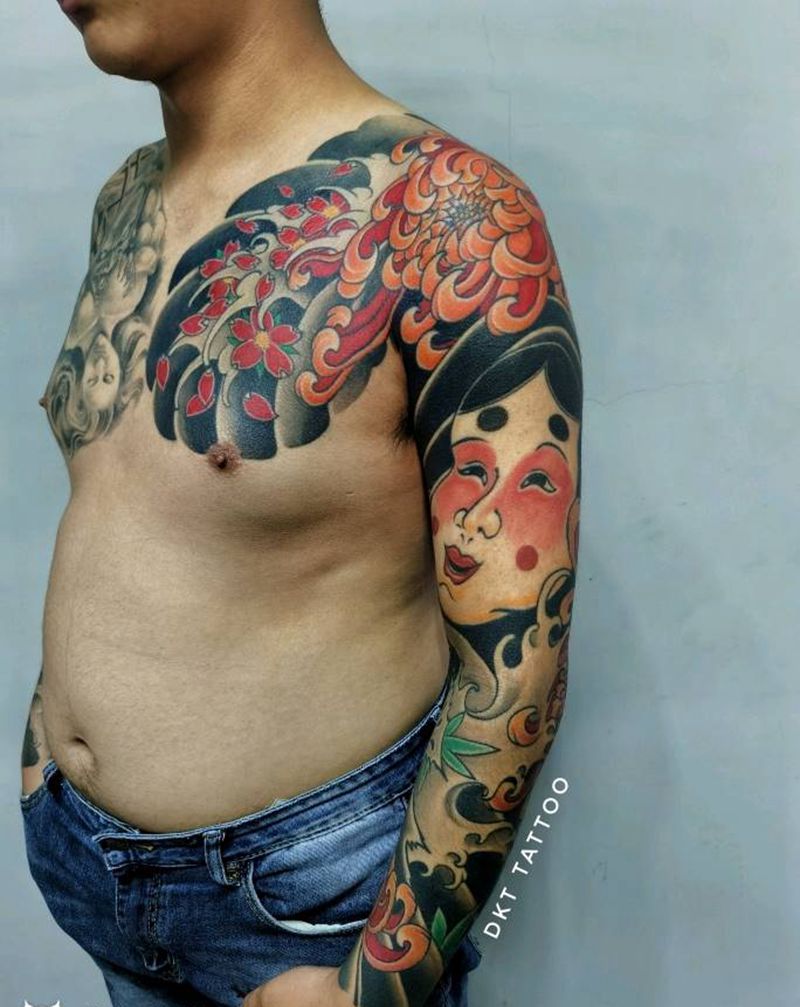 当前位置: 首页 >吉林省长春市纹身店-彫客堂刺青纹身图案>老传统花臂能面菊花纹身图片_手臂老传统纹身图案