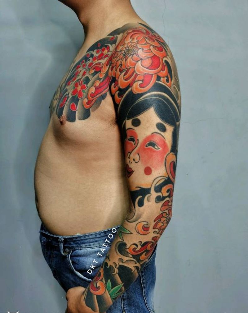 老传统花臂能面菊花纹身图片_手臂老传统纹身图案