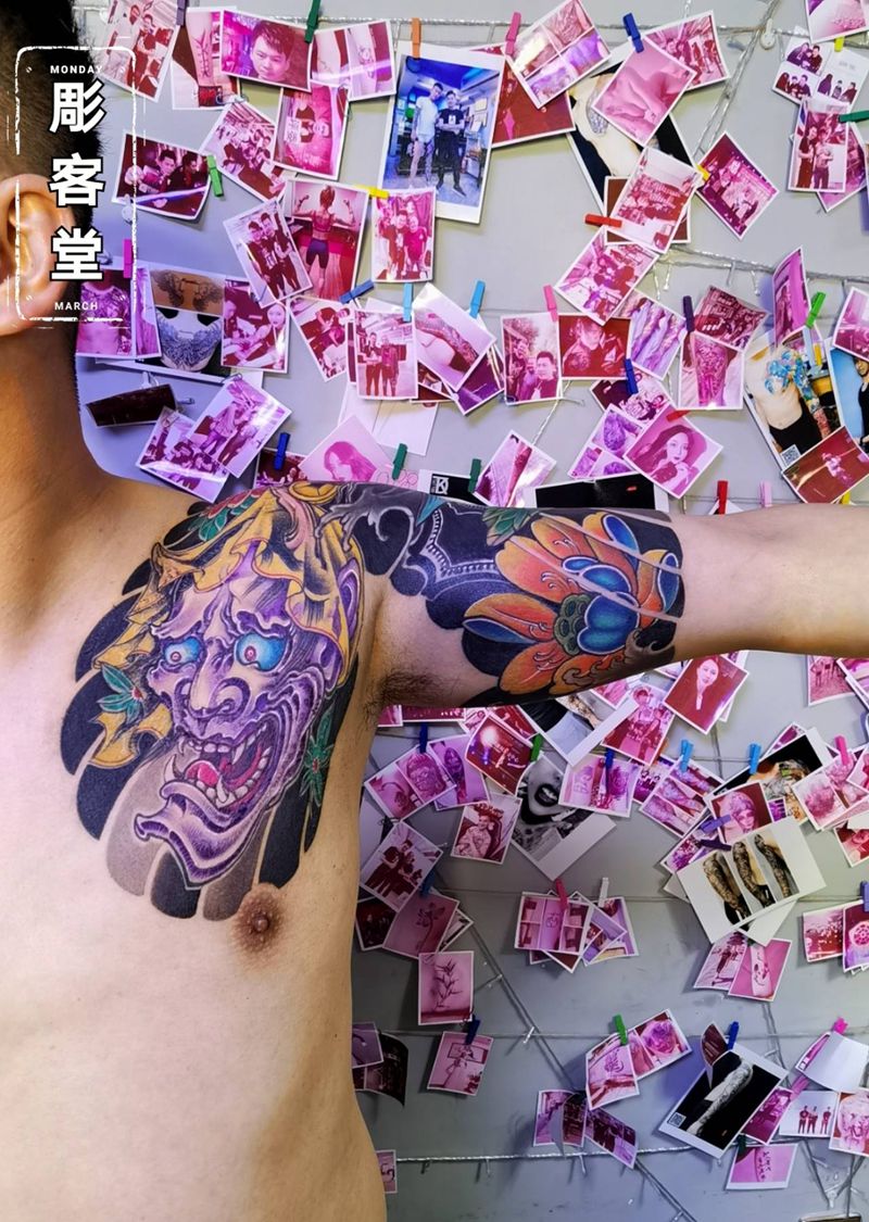 半甲般若鲤鱼遮盖作品纹身图片_手臂胸部新传统遮盖纹身图案