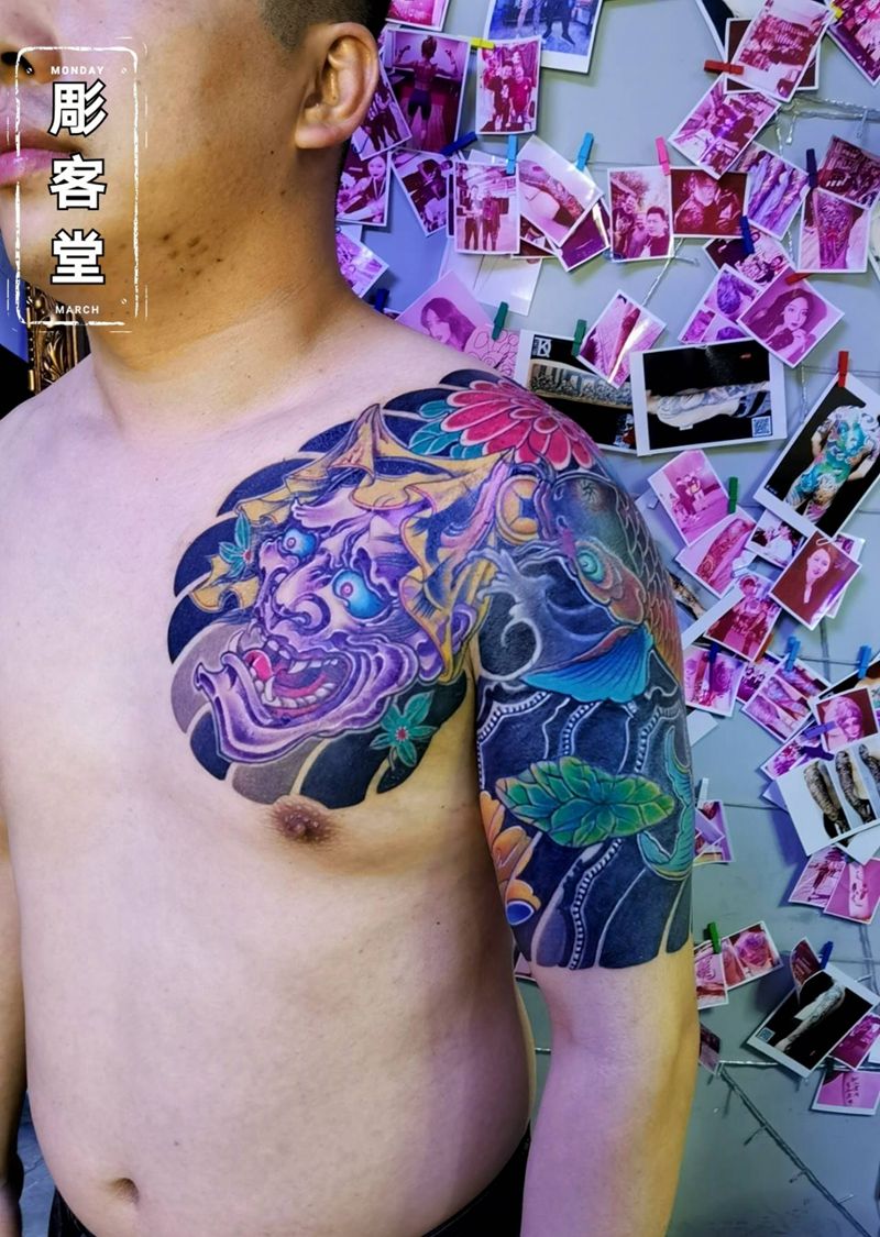 半甲般若鲤鱼遮盖作品纹身图片_手臂胸部新传统遮盖纹身图案
