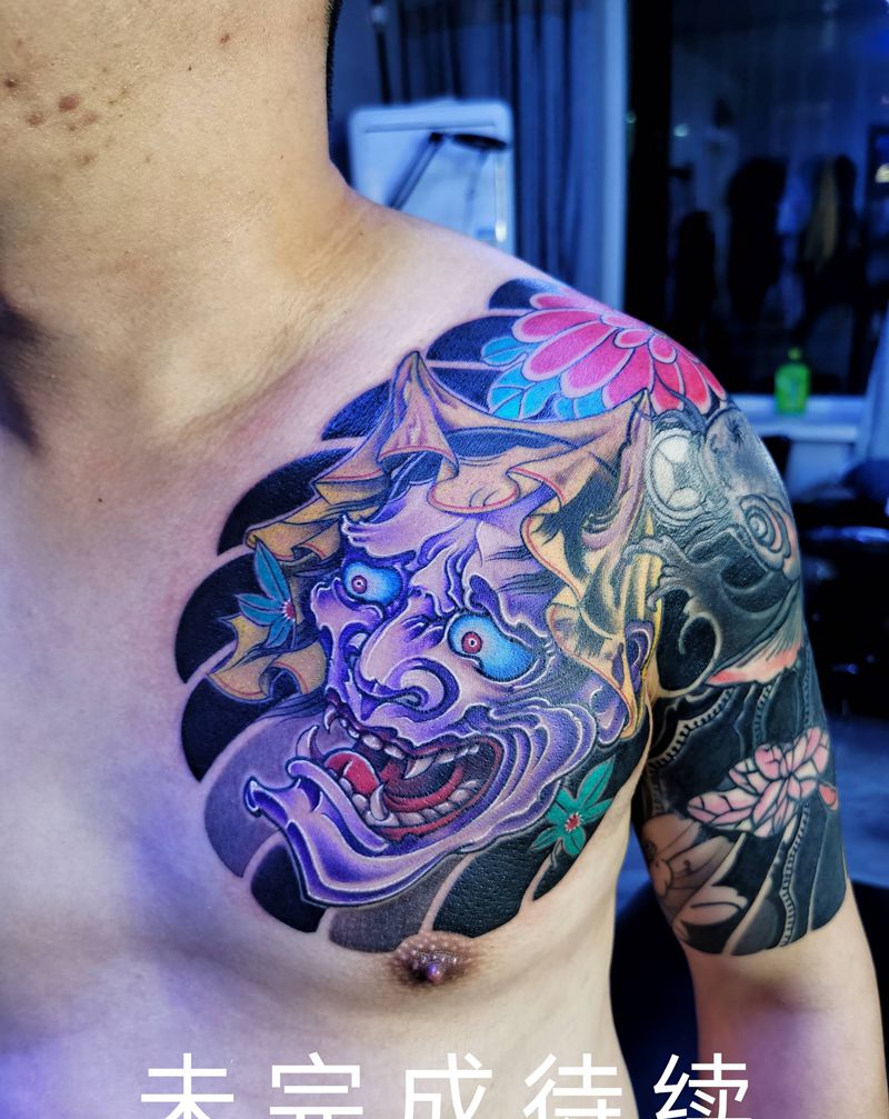 半甲般若鲤鱼遮盖作品纹身图片_手臂胸部新传统遮盖纹身图案