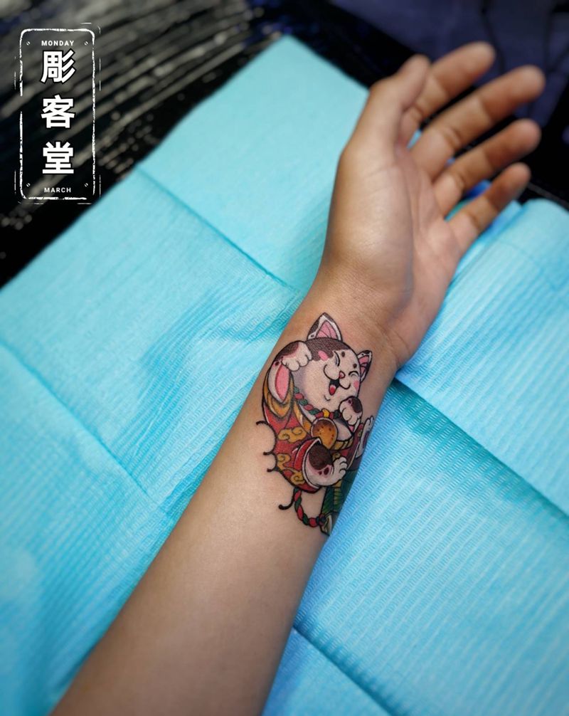 当前位置: 首页 >吉林省长春市纹身店-彫客堂刺青纹身图案>招财猫遮盖作品纹身图片_手臂纹身图案