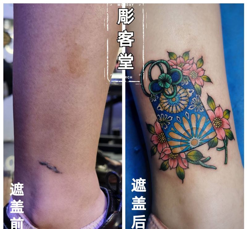脚踝纹身小吊牌遮盖作品纹身图片_腿部新传统遮盖纹身图案