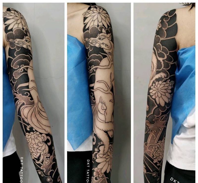 当前位置: 首页 >吉林省长春市纹身店-彫客堂刺青纹身图案>老传统九尾狐花臂未完成待续纹身图片_手臂老传统纹身图案