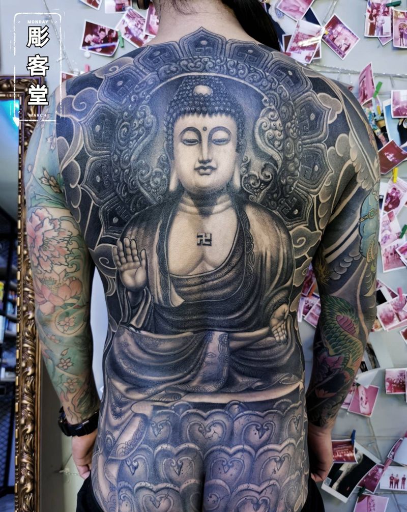 满背如来佛徒弟作品纹身图片_背部新传统欧美写实石雕纹身图案