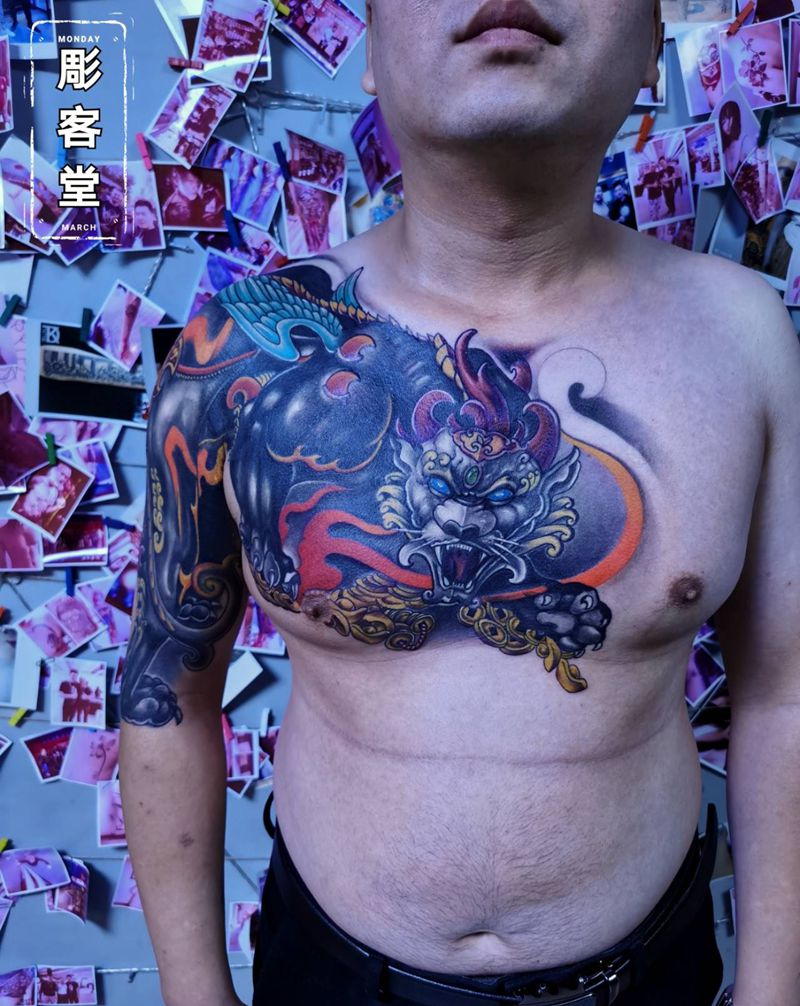 当前位置: 首页 >吉林省长春市纹身店-彫客堂刺青纹身图案>披肩貔貅纹身图片_手臂胸部新传统纹身图案