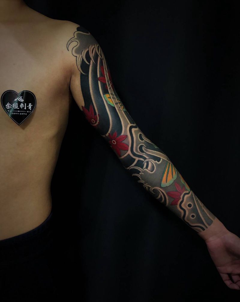当前位置: 首页 >吉林省长春市纹身店-金楹刺青纹身图案>鲤鱼锦鲤花臂纹身图片_手臂肩部老传统新传统鱼水浪纹身图案